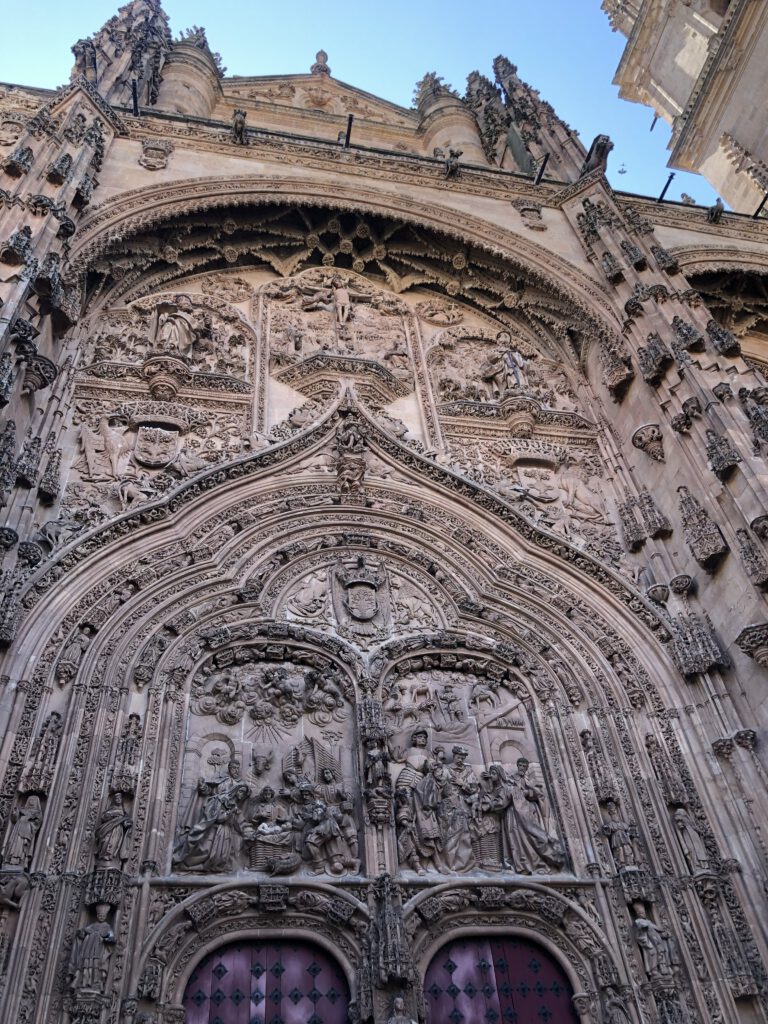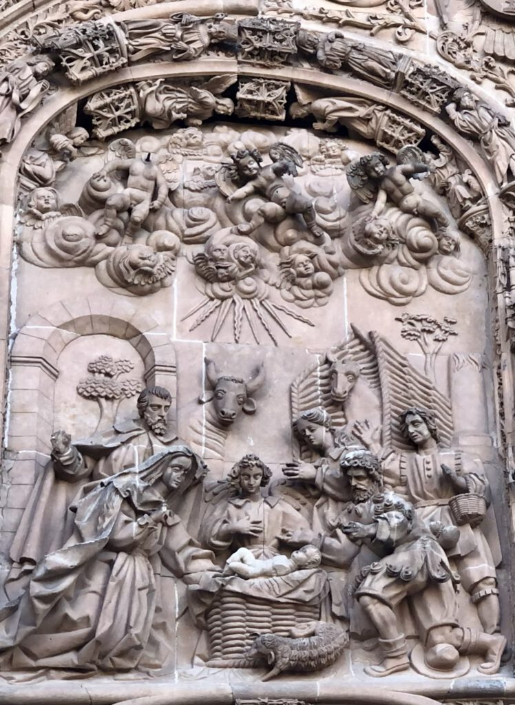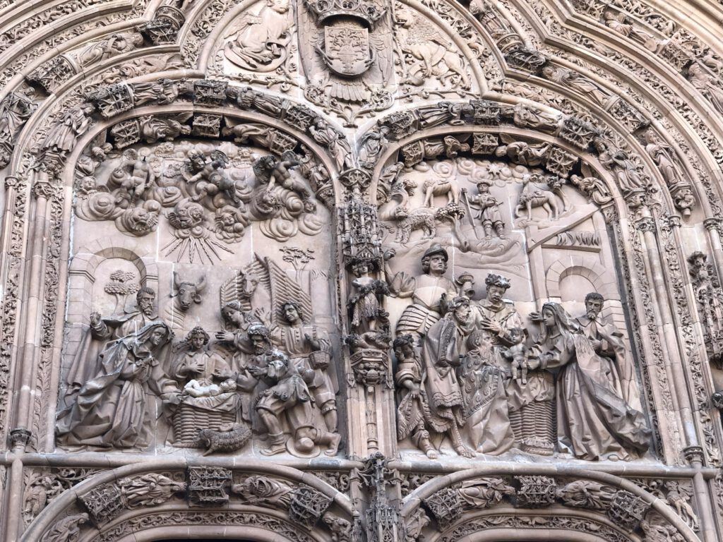 En la Fachada principal está el impresionante pórtico de la Natividad una narración bíblica tallada en piedra del Nacimiento de Jesús y de la Epifanía.