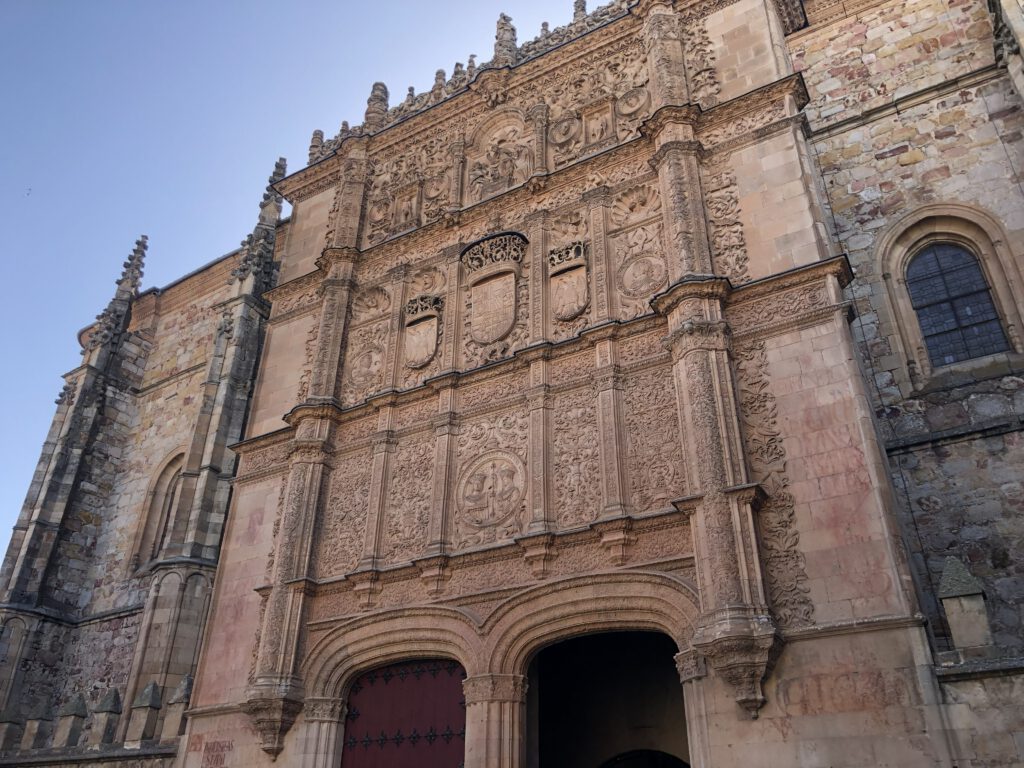 Lo primero que verás es su fachada monumental, un auténtico tapiz de piedra dorada que parece una obra de encaje. Es un ejemplo perfecto del plateresco español, ese estilo tan salmantino que mezcla lo religioso con la exuberancia decorativa.