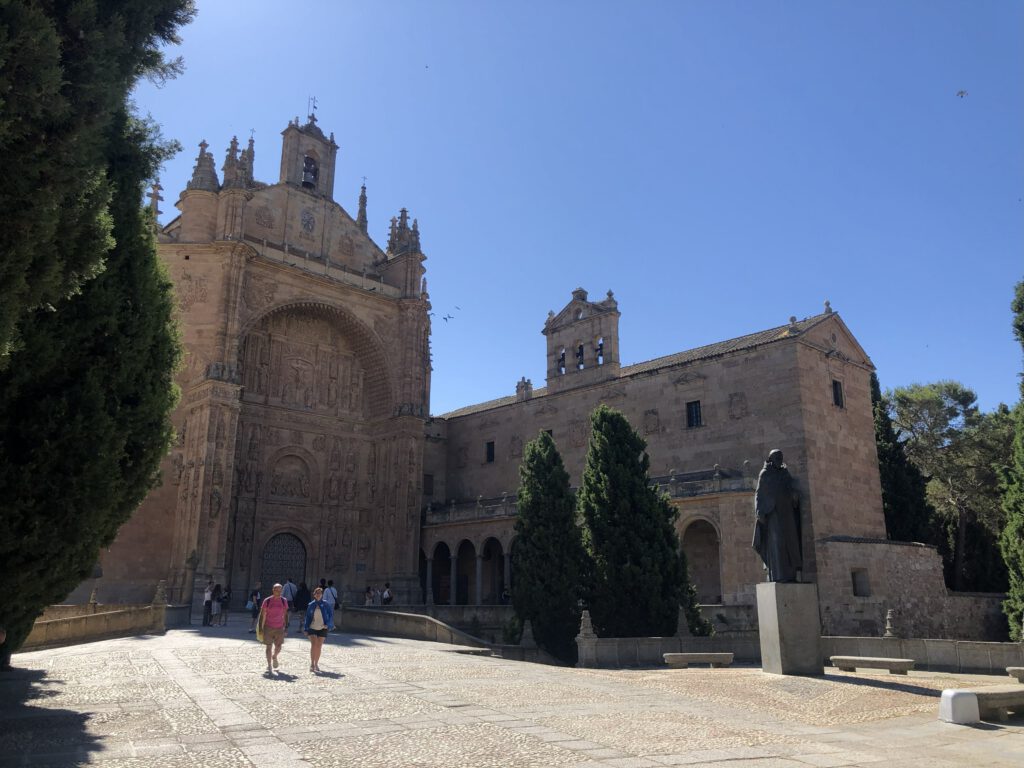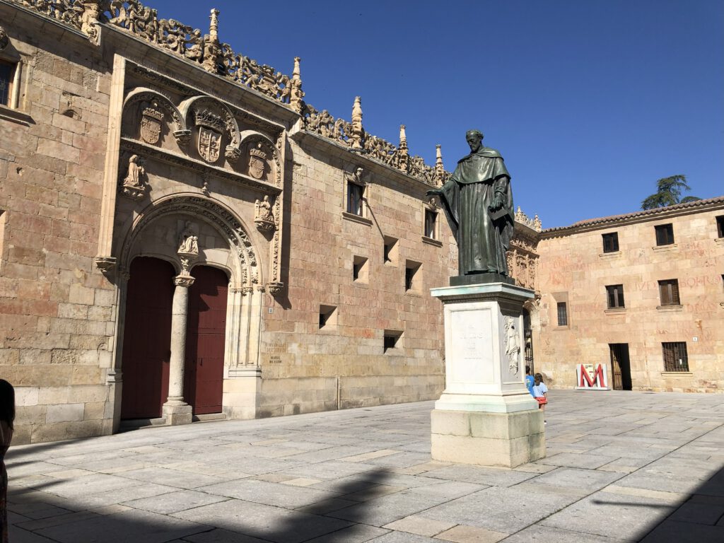 La estatua de Fray Luis de León nos recibe en este amplio espacio. Este profesor de teología del s. XVI es uno de los iconos de la Universidad de Salamanca, y su frase más célebre “Como decíamos ayer…”.