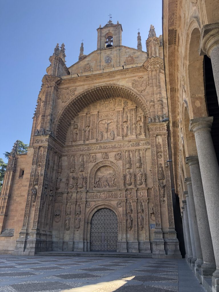 Su fachada es un espectáculo de simetría barroca, con tres cuerpos adornados por columnas salomónicas y estatuas. El conjunto incluye la iglesia y el colegio, hoy sede de la Universidad Pontificia de Salamanca.